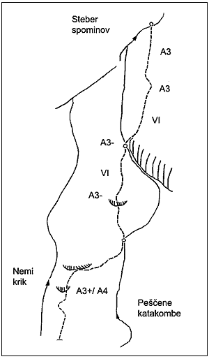 ABLA DABLA Najzahtevnejši je prvi raztežaj, v katerem plezalec enostavno ne sme pasti. Smer vstopi med Nemim krikom in Peščenimi katakombami. Prva dva raztežaja potekata levo od katakomb, le stojišča so skupna z njimi. Zadnji raztežaj pa poteka desno od katakomb. Smer še nima ponovitve.